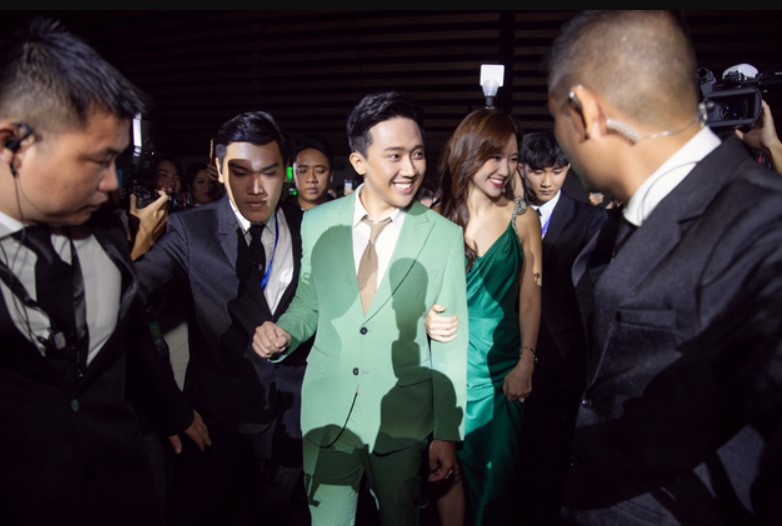Xuất hiện trong sự kiện này, cặp đôi diện đồ vô cùng ăn nhập khi Hari Won chọn chiếc diện đầm xanh, kiểu dáng lệch vai ôm sát cơ thể còn Trấn Thành diện suit lịch lãm cùng tông màu.