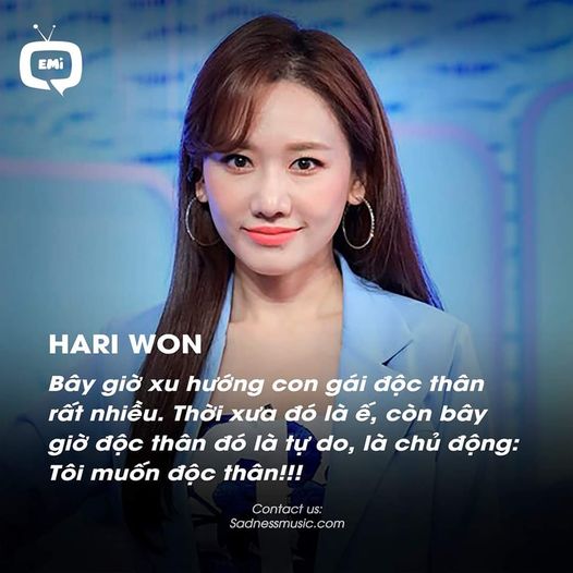 Mới đây, phát ngôn của Hari Won về quan điểm độc thân bất ngờ được chia sẻ trong trong 1 diễn đàn hơn 600.000 thành viên. Cụ thể, bài đăng này đã trích lại một phát ngôn trong quá khứ của Hari Won về xu hướng độc thân: “Bây giờ xu hướng độc thân rất nhiều. Thời xưa đó là ế, còn bây giờ độc thân là tự do, là chủ động.”