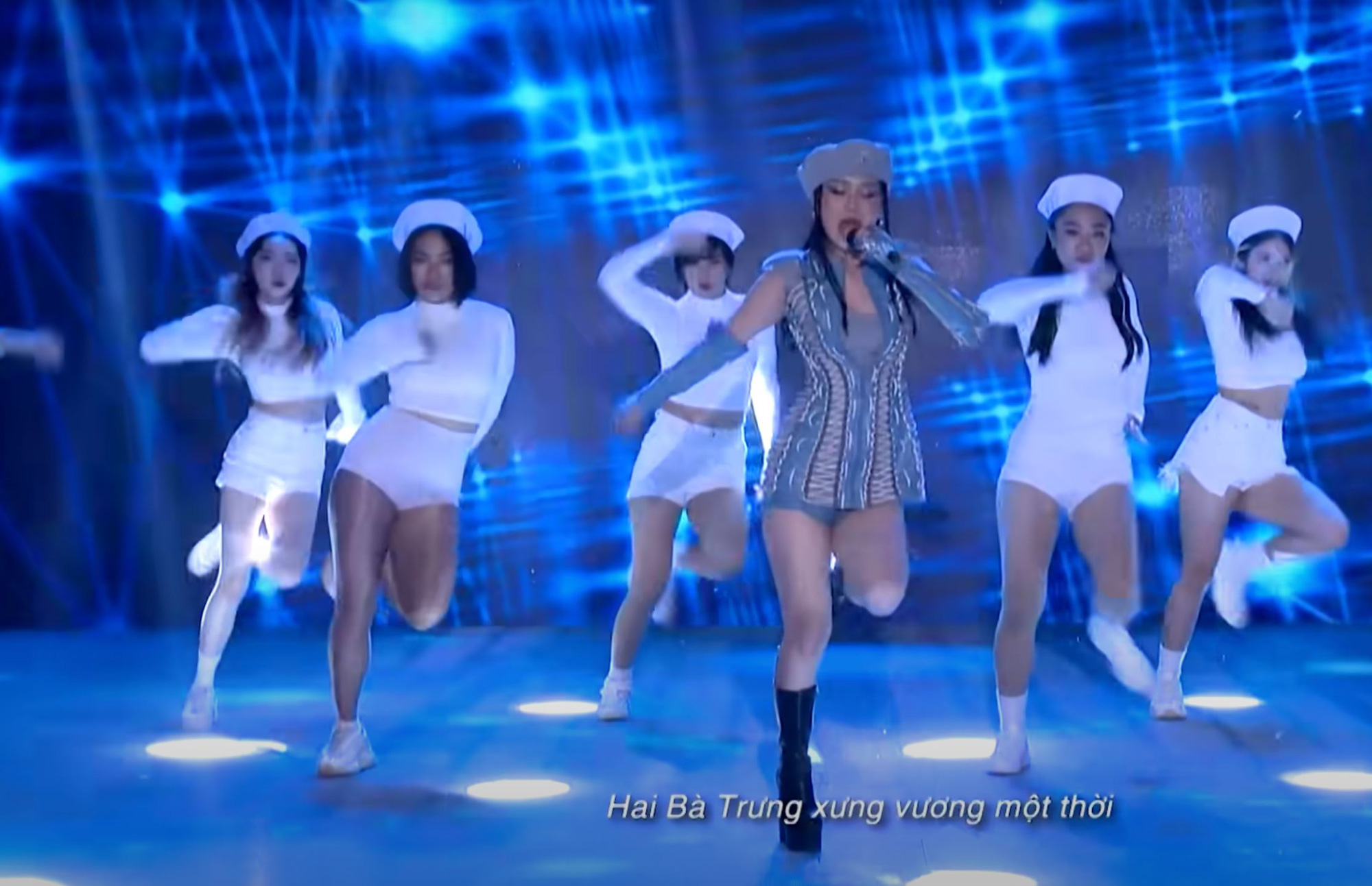 Cụ thể, trong tiết mục của mình, nữ ca sĩ đã sử dụng một đoạn trong bài hát bài hát Cô gái mở đường (nhạc sĩ Xuân Giao) và có 1 đoạn rap tôn vinh các nữ anh hùng dân tộc: “Nữ nhân hào khí ngút trời. Mẫu Âu Cơ vạn tuế. Hai Bà Trưng xưng vương một thời còn Hồ Xuân Hương lưu danh hậu thế. Đàn ông dù có là ai thì cũng được sinh ra từ một người phụ nữ. Chị em chúng tôi là một cuốn từ điển còn các anh thì luôn phải tìm từng chữ".