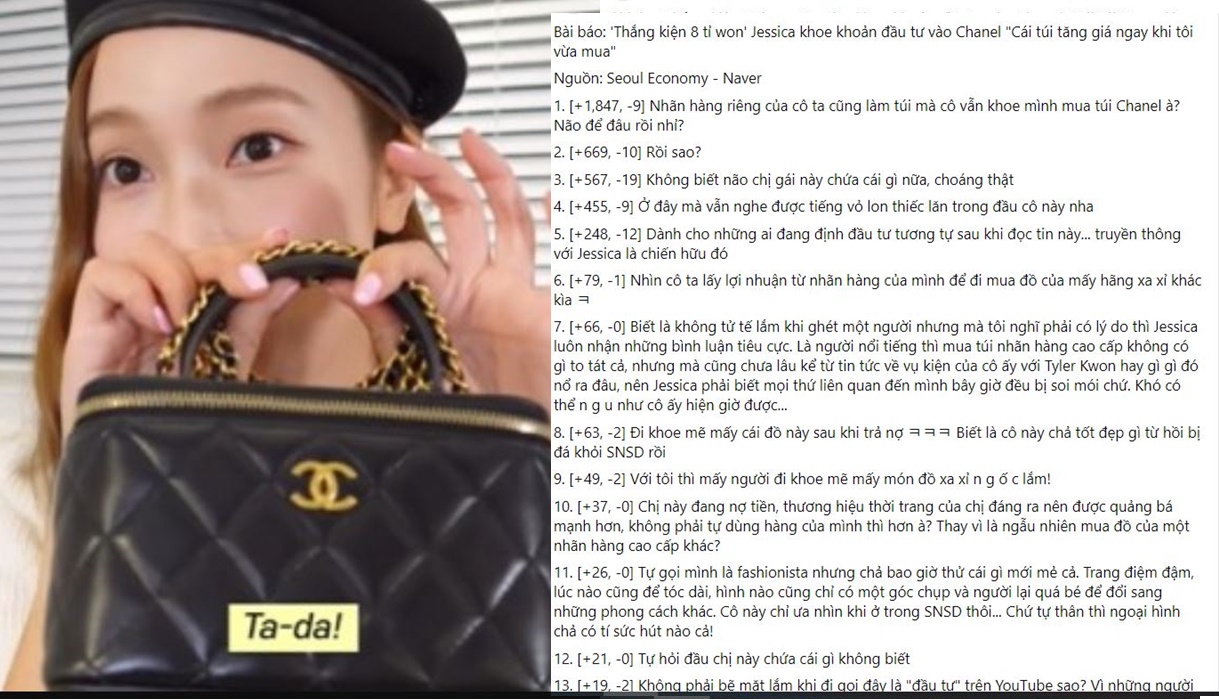 Mới đây, 1 bài đăng trên trang Naver của Hàn Quốc đã bàn luận về clip đập hộp hàng hiệu của Jessica giữ lùm xùm nợ nần: “Thắng kiện 8 tỉ won' Jessica khoe khoản đầu tư vào Chanel "Cái túi tăng giá ngay khi tôi vừa mua"