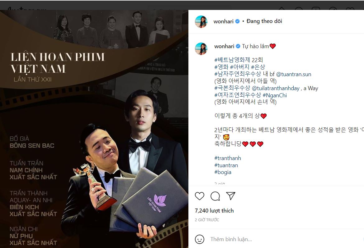 Không chỉ Trấn Thành mà Hari Won cũng đã chia sẻ thành tích của ‘Bố Già’ trên trang cá nhân. Nữ ca sĩ chia sẻ hình ảnh ông xã của mình lên nhận giải thưởng danh giá và đi kèm dòng trạng thái thể hiện sự tự hào của mình.