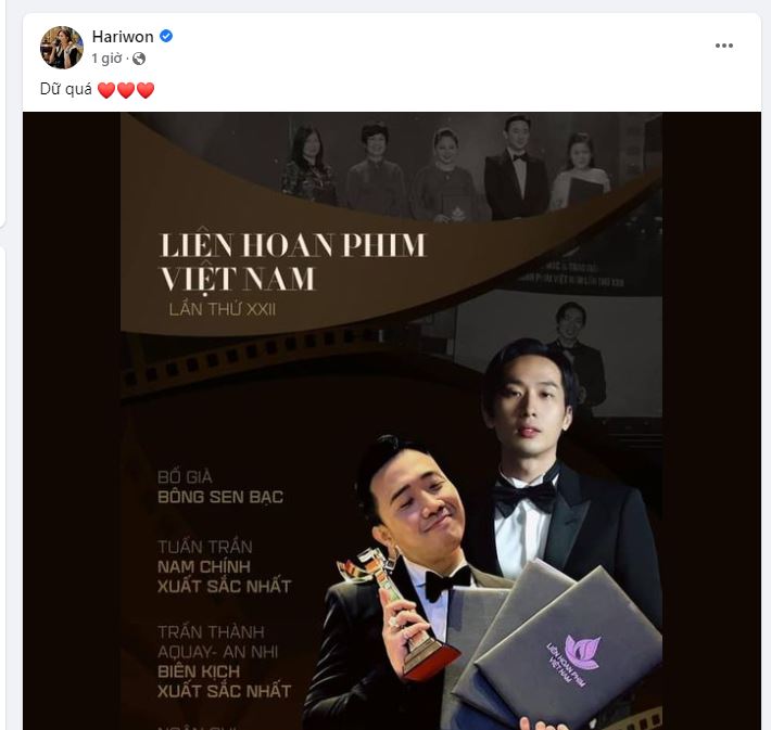 Những bài chia sẻ của Hari Won đã nhận về được hàng loạt lời chúc mừng của khán giả khi ‘đứa con tinh thần’ của Trấn Thành nhận về sự công nhận của giới chuyên môn sau những thành tích ấn tượng ở phòng vé.