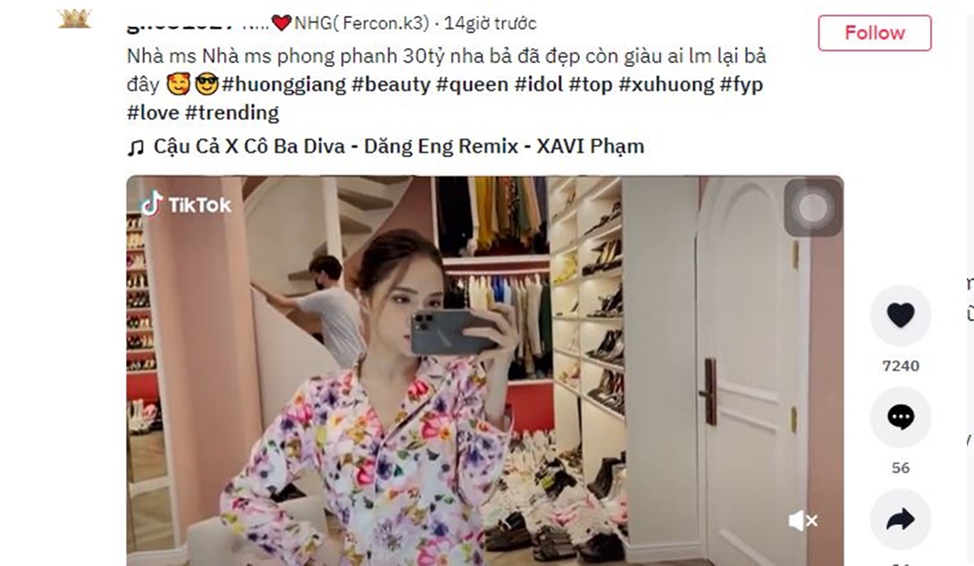 Mới đây, 1 tài khoản người hâm mộ Hương Giang đã đăng tải và bàn tán về việc nữ ca sĩ đăng tải clip chia sẻ những hình ảnh bên trong căn biệt thự triệu đô.