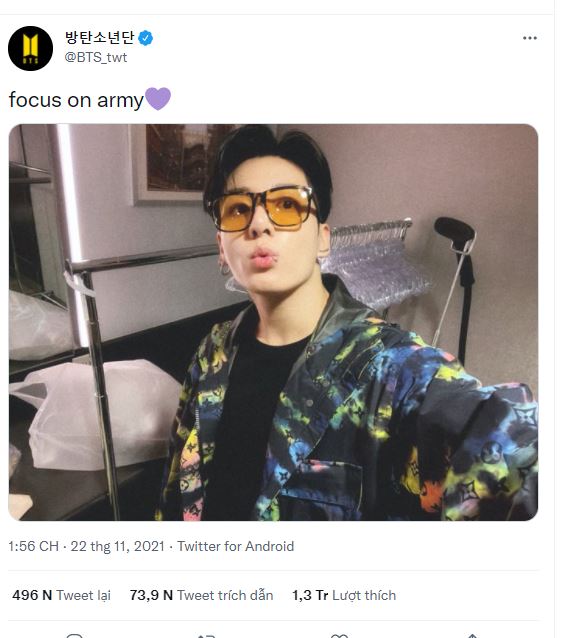 Ngay lập tức, JungKook sau đó đã đăng tải lên Twitter hình ảnh mới nhất cùng chú thích Focus on Army (tập trung vào fandom Army) để giải thích về câu phát biểu thiếu sót của mình.