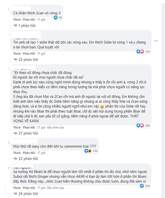 Tuy nhiên, ở dưới phần bình luận, hàng loạt bình luận thể hiện sự phản đối với quyết định loại thí sinh của nam rapper trong tập vừa qua: