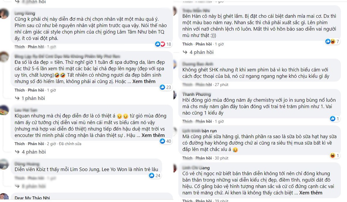 "Dù chị ấy có đẹp cỡ nào thì lão hóa cũng chẳng tha bất kỳ ai. Jang Ki Yong trông trẻ hơn nhiềuuuuuu và cách biệt quá rõ rệt. Lão hóa là thuận tự nhiên thôi, nhưng chị ấy không thấy ngán khi chỉ đóng một kiểu vai luẩn quẩn suốt bao nhiêu phim à, như thể chỉ thay mỗi nam chính thôi ấy? Còn tôi thì đã hơi bứ với kiểu gần 40 mà chuyên đóng phim tình cảm với các anh trai hơn 20 rồi."