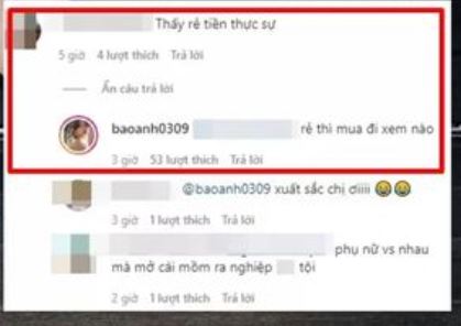 Bức ảnh này đã nhận về hơn 32.00 lượt thích sau nhiều ngày đăng tải. Bên cạnh những lời khen về thần thái của Bảo Anh, bức ảnh này cũng nhận về không ít lời bình luận khiếm nhã vì sự táo bạo.Đáng nói, xuất hiện 1 bình luận đầy khiếm nhã khi để lại nhận xét ‘rẻ tiền’ cho bức ảnh của Bảo Anh. Ngay lập tức, trước bình luận ‘Thấy rẻ tiền thực sự!”, Bảo Anh đã thẳng thừng đáp trả: “Rẻ thì mua đi xem nào”.