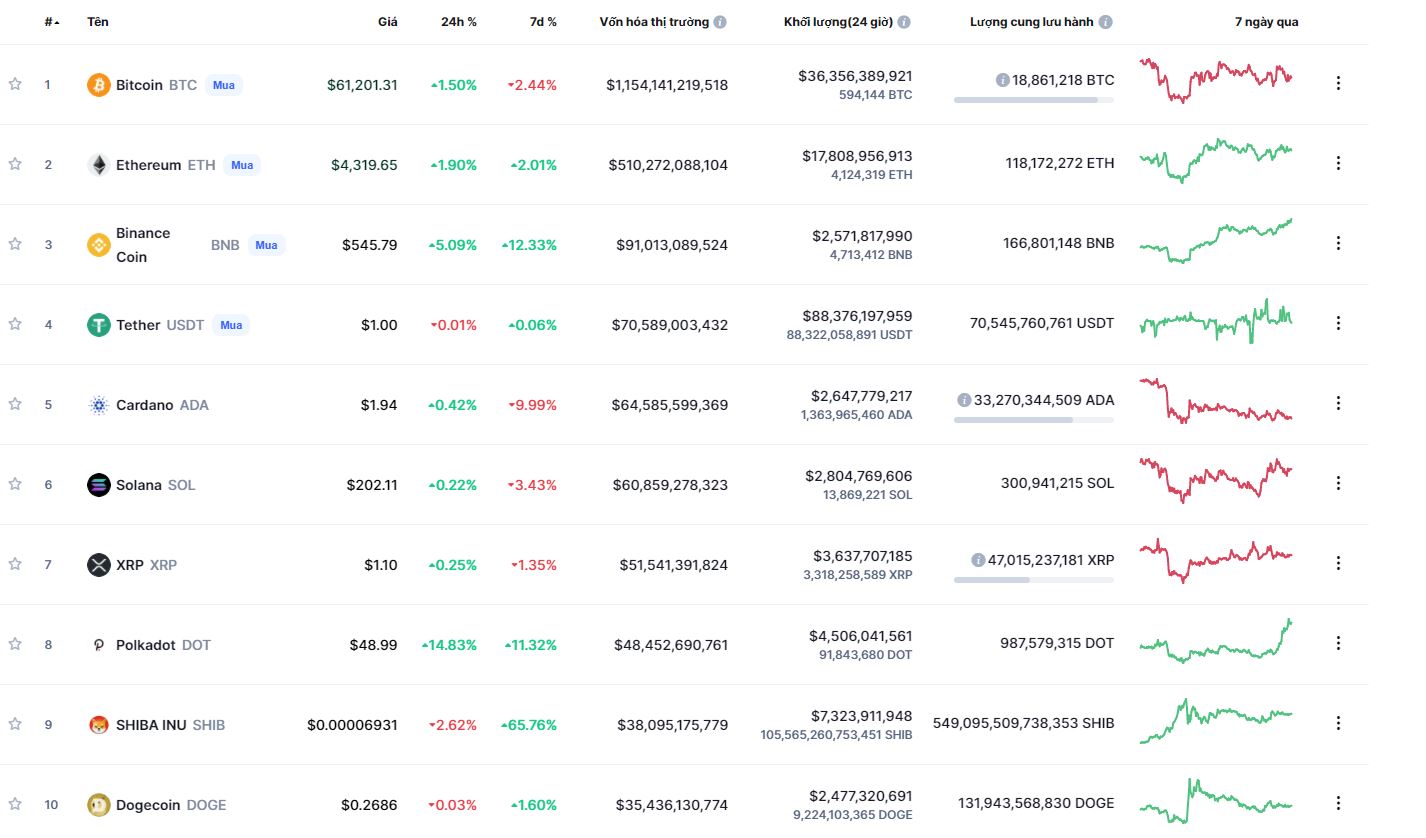 Trong suốt 24 giờ qua, giá Bitcoin biến động trong khoảng hẹp khi đạt giá cao nhất ở mức 62.468 USD và thấp nhất ở mức 59.562 USD. Với diễn biến khó lường này, thị trường tiền ảo gần như đi ngang trong 1 ngày qua.