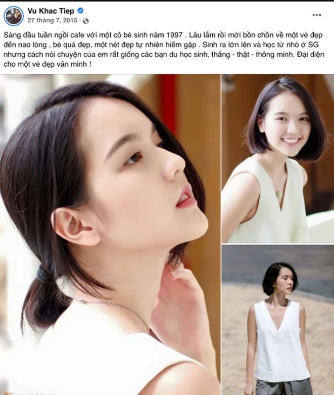 Theo đó, Vũ Khắc Tiệp đã vô cùng ấn tượng khi có dịp ngồi cafe với cô nàng: “Sáng đầu tuần ngồi cafe với một cô bé sinh năm 1997. Lâu lắm rồi mới bồn chồn về một vẻ đẹp đến nao lòng, bé quá đẹp, một nét đẹp tự nhiên hiếm gặp. Sinh ra lớn lên và học từ nhỏ ở Sài Gòn nhưng cách nói chuyện của em rất giống các bạn du học sinh, thẳng - thật - thông minh. Đại diện cho một vẻ đẹp văn minh!".