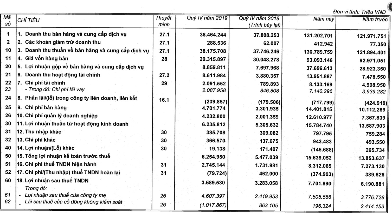 Theo đó, doanh thu thuần hợp nhất trong quý đạt 38.176 tỷ đồng, tăng 1,1% so với cùng kỳ năm trước. Lợi nhuận trước thuế quý 4 năm 2019 đạt 6.255 tỷ đồng, 3.590 tỷ đồng là lợi nhuận sau thuế, tăng lần lượt là 14% và 9% so với cùng kỳ.