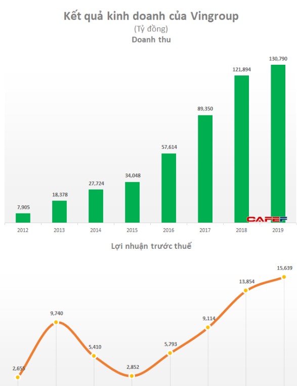 Trong năm 2019, tập đoàn của tỷ phú Phạm Nhật Vượng có doanh thu thuần đạt 130.790 tỷ đồng, lợi nhuận trước thuế đạt 15.639 tỷ đồng, lợi nhuận sau thuế đạt 7.702 tỷ đồng tăng lần lượt 7,3%, 12,9% và 24,4% so với năm trước.