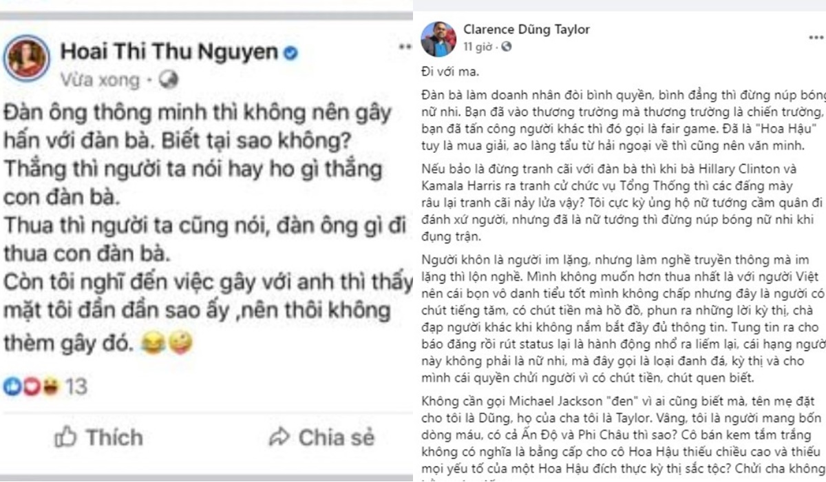 Trong suốt 2 tiếng đồng hồ, Dũng Taylor đã phân tích và phản bác lại từng câu trong trạng thái mới nhất của hoa hậu Thu Hoài. Anh khẳng định cách gọi “Dũng Đen” của Thu Hoài là một cách phân biệt chủng tộc. Anh cũng cho biết anh đã chụp lại những câu nói với từ ngữ miệt thị của Thu Hoài phòng trường hợp cần đối chứng và cung cấp bằng chứng cho cơ quan chức năng.