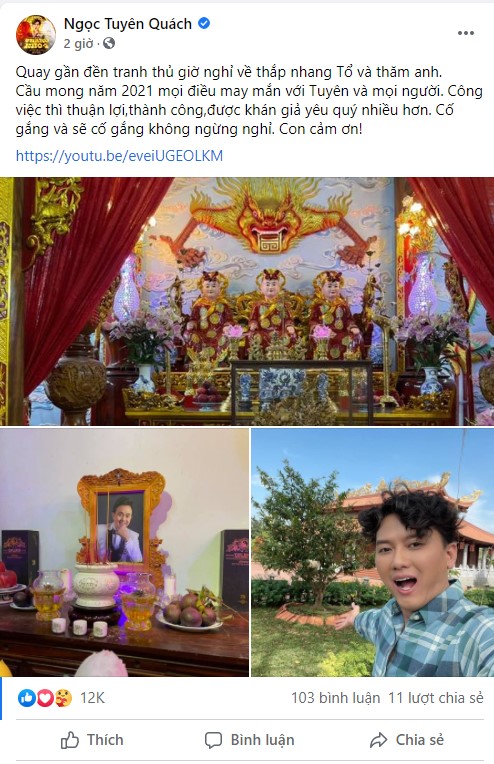 Nam diễn viên chia sẻ: “Quay gần đền tranh thủ giờ nghỉ về thắp nhang Tổ và thăm anh.Cầu mong năm 2021 mọi điều may mắn với Tuyên và mọi người. Công việc thì thuận lợi,thành công,được khán giả yêu quý nhiều hơn. Cố gắng và sẽ cố gắng không ngừng nghỉ. Con cảm ơn!”
