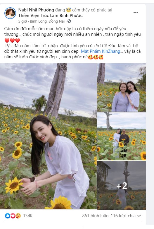 Bà xã Trường Giang chia sẻ hình ảnh đi thăm Thiền Viện Trúc Lâm Bình Phước với dòng trạng thái: “Cảm ơn đời mỗi sớm mai thức dậy ta có thêm ngày nữa để yêu thương... chúc mọi người ngày mới nhiều an nhiên, tràn ngập tình yêu”. Nhã Phương được biết là người thường xuyên lui tới đến chùa, thiền viện để tìm cho mình cảm giác an yên, có thêm năng lượng tích cực.