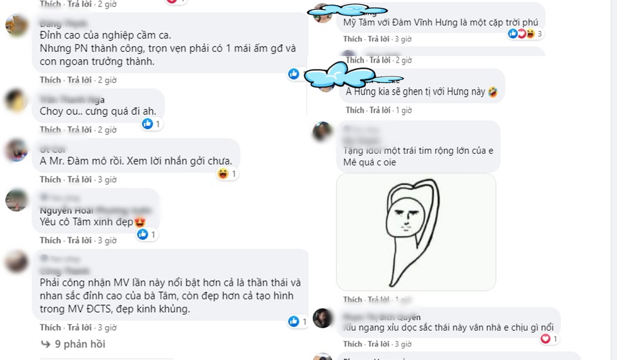Khi thấy Mỹ Tâm đăng ảnh phân cảnh có phần tình cảm với nhạc sĩ Khắc Hưng dù chỉ là trong MV, khán giả vẫn gọi tên Đàm Vĩnh Hưng ở phần bình luận: “Anh Hưng kia sẽ ghen tị với Hưng này mất”, “Mỹ Tâm với Đàm Vĩnh Hưng là một cặp trời phú”, “A Mr. Đàm đâu rồi. Xem lời nhắn gửi chưa?”.