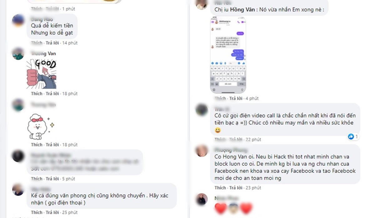 “Cô Hồng Vân ơi, nếu bị hack thì tốt nhất mình chặn luôn cô ơi. Để mình không bị lừa và người chủ nhân của Facebook nên khóa, xóa tài khoản cũ và lập cái mới để đảm bảo an toàn.”