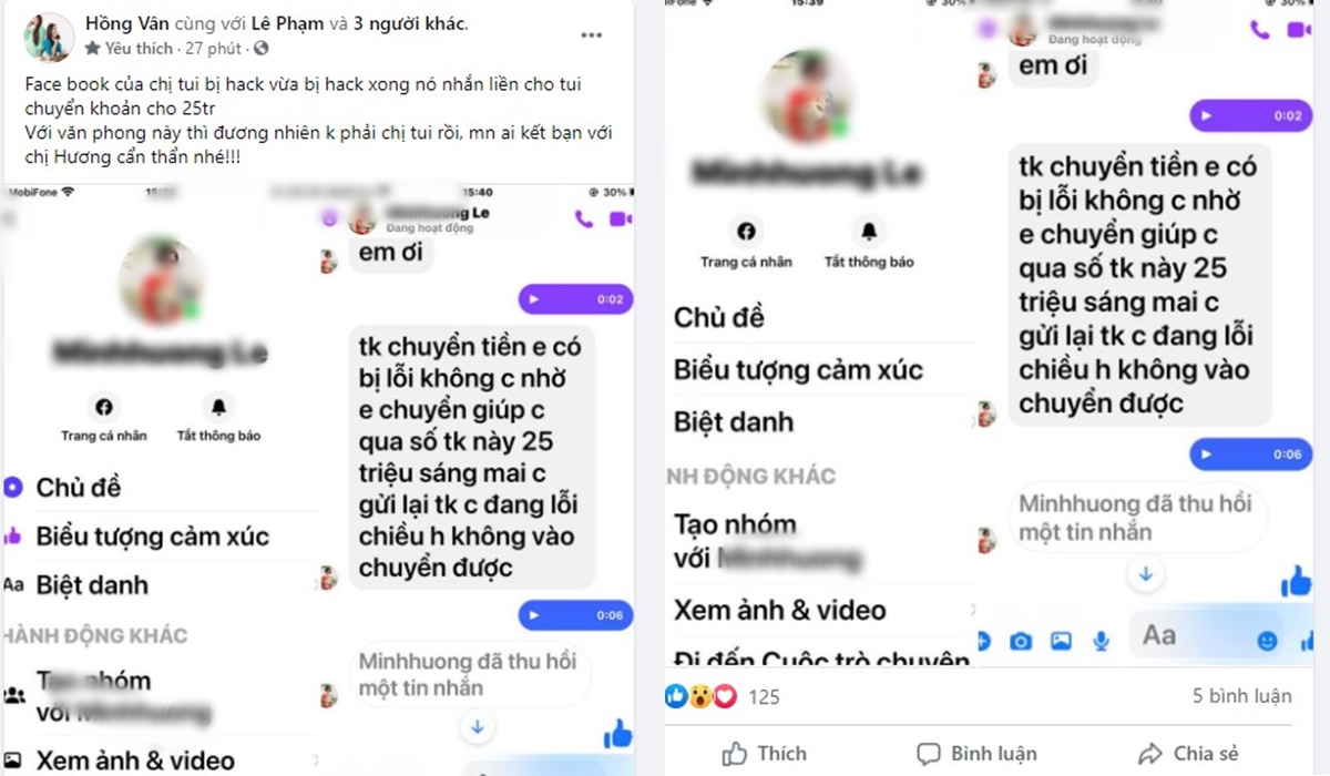 Việc hack tài khoản facebook rồi nhắn tin cho danh sách người quen để lừa đảo tiền không còn quá lạ lẫm. Tuy nhiên vẫn có người bị hình thức này lừa đảo thành công và mất tiền một cách ‘trời ơi đất hỡi’. Đặc biệt, tài khoản của những người nổi tiếng hay những ai có sức ảnh hưởng lại là đối tượng thường bị các hacker nhắm tới. Với trường hợp của NSND Hồng Vân, nếu như không tỉnh táo và không có kinh nghiệm thì cô hoàn toàn đã có thể mất trắng 25 triệu.