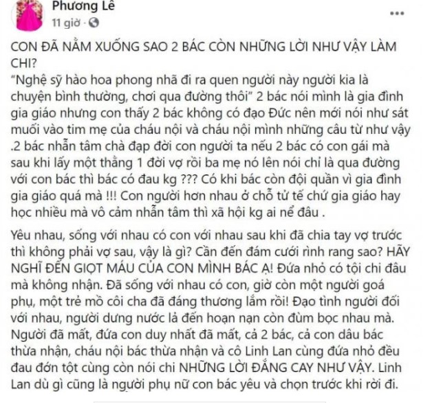 Hoa hậu Phương Lê đã bức xúc đăng đàn trên trang cá nhân khi cho rằng câu nói của bố mẹ nam ca sĩ như xát muối vào tim của chính cháu nội và Linh Lam, thậm chí còn cho rằng bố mẹ của cố nghệ sĩ không có đạo đức, quá nhẫn tâm.