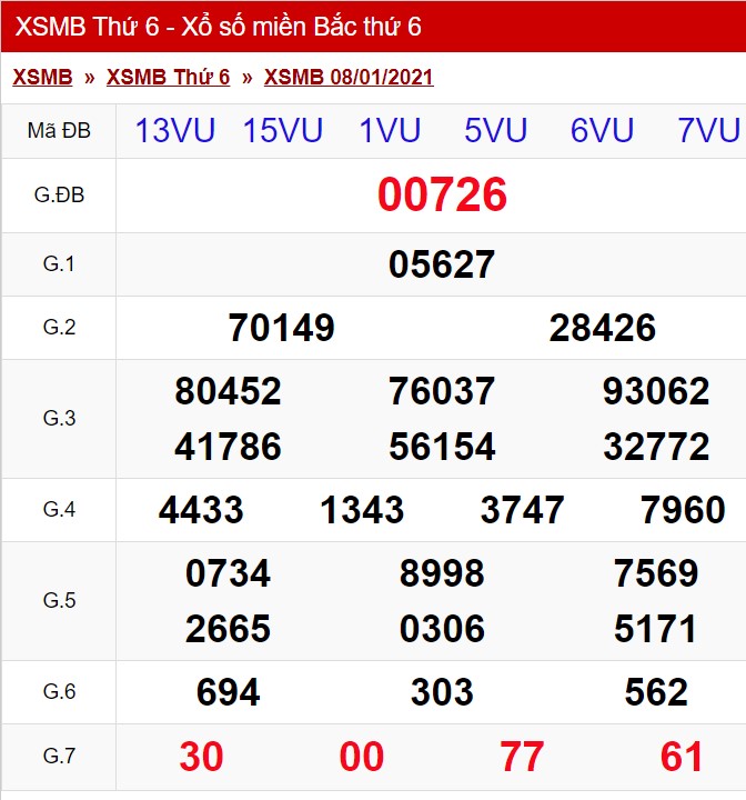 Kết quả Xố sổ Miền Bắc XSMB ngày 8/1