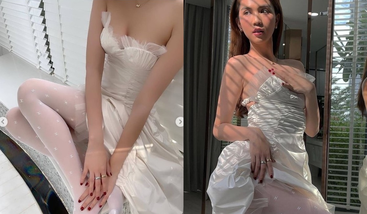 Đáng nói, Ngọc Trinh đã diện một chiếc đầm cúp ngực táo bạo với chất liệu vải bóng pha ren, tạo ra cảm giác vừa sang chảnh lại quá sức gợi cảm. Đặc biệt là đôi vớ xuyên thấu lại khiến chân dài xứ Trà Vinh nóng bỏng hơn bao giờ hết.