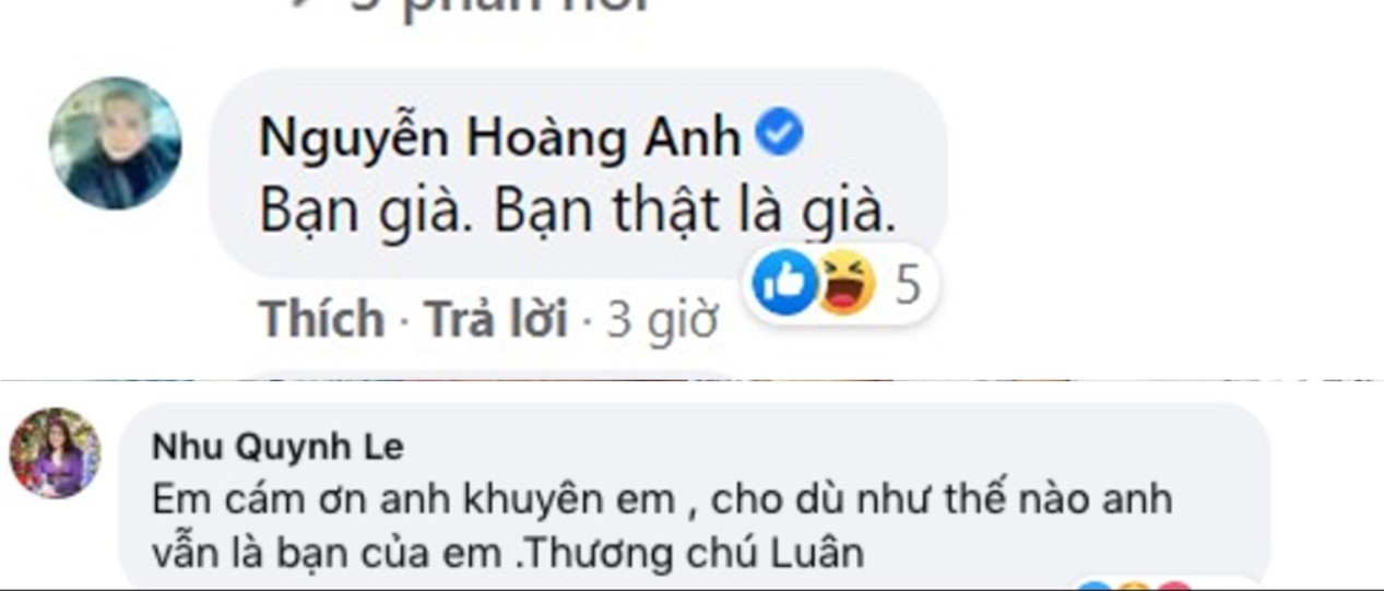 Giữa lúc bị chỉ trích khi bênh vực Hoàng Anh giữa ồn ào, Minh Luân như muốn nói rằng anh không nghiêng về bất kỳ ai mà luôn coi cả Hoàng Anh và Quỳnh Như là những người bạn thân thiết. Đáng nói, vợ cũ của Hoàng Anh cũng để lại bình luận phía dưới bài đăng của Minh Luân và thể hiện thái độ vô cùng trân trọng và thân thiết: “Em cám ơn anh khuyên em, cho dù như thế nào anh vẫn là bạn của em. Thương chú Luân”.