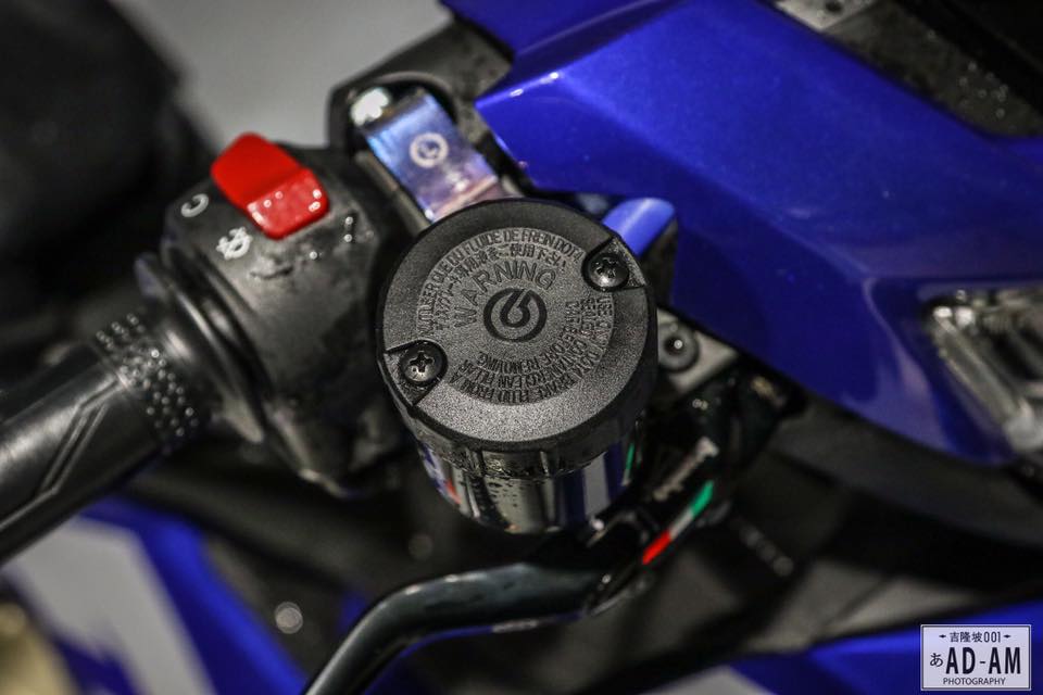 Phần độ đáng chú ý đầu tiên là bộ tay thắng Brembo RCS 19 siêu phẩm corsa corta đi kèm với bình dầu cùng thương hiệu màu xám trong suốt giúp chủ xe có thể kiểm tra được tình trạng dầu hao hụt để châm thêm. Vì kích thước thắng tay thắng quá lớn nên chủ xe phải cắt phần dàn áo khá nhiều để khi tháo ráp không bị cấn trầy.