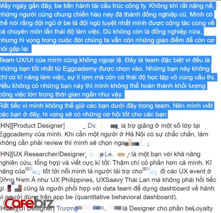 Hiện tại, những lời tạm biệt từ nhân viên của Be đã xuất hiện trên mạng xã hội, thậm chí có cả những status giới thiệu nhân sự - những con người đã chiến đấu với quyết tâm "đánh đuổi giặc ngoại xanh", kèm thông báo rằng vẫn còn nửa team ở lại bám trụ với "team vàng".