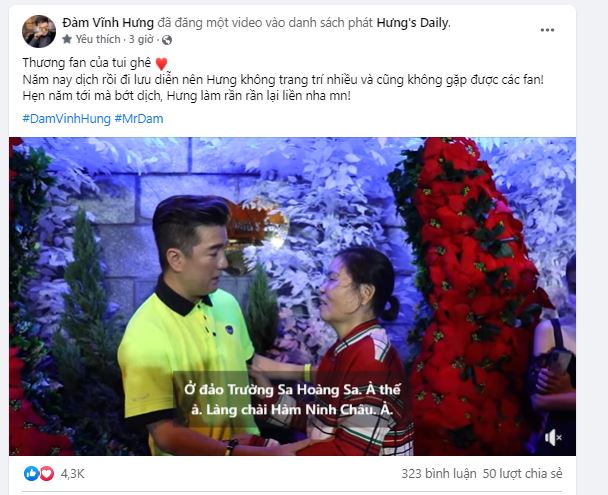 Mới đây, trên trang cá nhân của Đàm Vĩnh Hưng bày tỏ niềm nuối tiếc khi không được ở bên người hâm mộ vào thời điểm giao năm này. Cụ thể anh viết: “Thương fan của tui ghê./Năm nay dịch rồi đi lưu diễn nên Hưng không trang trí nhiều và cũng không gặp được các fan! Hẹn năm tới mà bớt dịch, Hưng làm rần rần lại liền nha mọi người!".