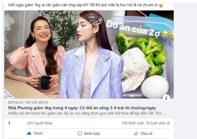 Ngay lập tức, thực đơn này hiện tại được các trang tin chia sẻ một cách rầm rộ. Bởi hiện tại đang trong thời điểm cận Tết khi nhu cầu làm đẹp, giảm cân của các chị em tăng cao. Đa phần thái độ của khán giả đều thể hiện sự kinh ngạc tột độ trước việc 4 ngày giảm được 4 cân của Nhã Phương, nhiều người còn ví von cô như bà tiên ‘hóa phép’ cho lớp mỡ thừa biến mất vậy. Không ít cư dân mạng còn tag, gắn thẻ anh em, bạn bè, người thân thử áp dụng để kịp có một chiếc eo thon, thân hình cân đối đón Tết.