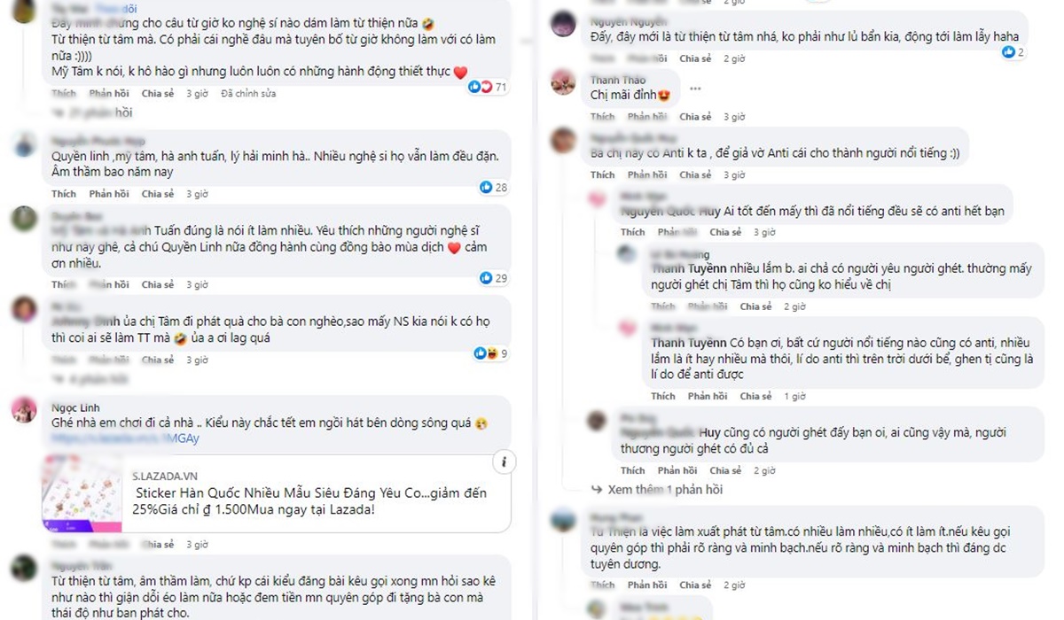 Tuy nhiên, lùm xùm kêu gọi từ thiện của các nghệ sĩ vẫn gây tranh cãi và bức xúc cho nhiều khán giả. Đặc biệt việc Thủy Tiên hay Đàm Vĩnh Hưng tuyên bố từ nay không kêu gọi từ thiện cũng nhận về nhiều bình luận trái chiều.