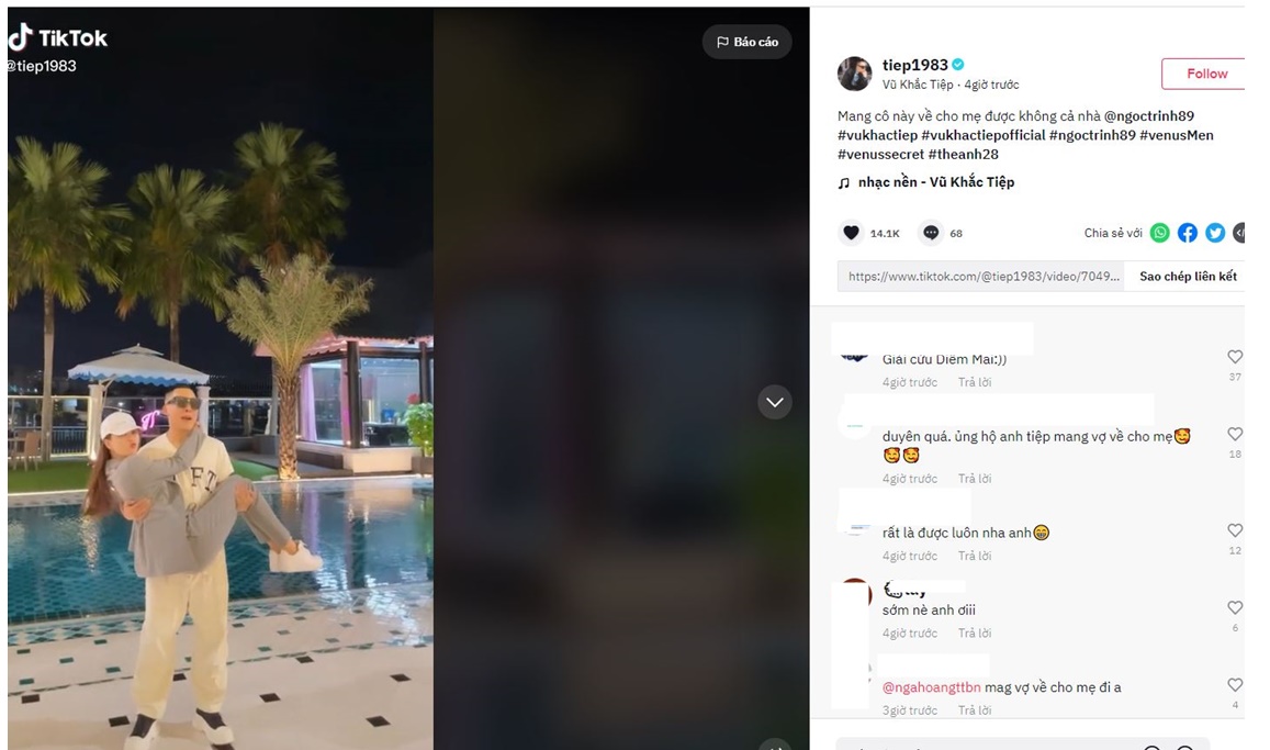 Cụ thể trên TikTok cá nhân, Vũ Khắc Tiệp đã tăng tải 1 video với dòng trạng thái “Mang cô này về cho mẹ được không cả nhà”. Trong video là hình ảnh anh chàng đang bế Ngọc Trinh và rõng rạc hô to “Mang vợ về cho mẹ, đừng mang ưu phiền về cho mẹ”.