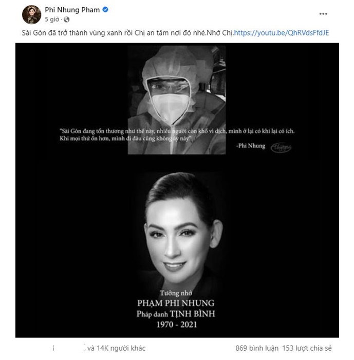 "Phi Nhung ơi, người dân Saigon và hàng triệu triệu người dân Việt Nam tri ân tấm lòng thiện nguyện của em. Saigon tạm ổn rồi mà em đã ra đi mãi mãi... Thương em thật nhiều."