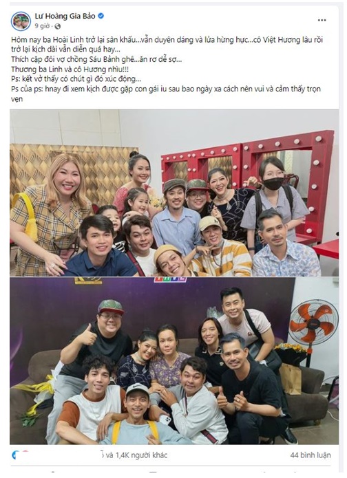 Mới đây, trên trang cá nhân của Lư Hoàng Gia Bảo - con nuôi NSƯT Hoài Linh chia sẻ dòng trạng thái xúc động chào mừng Hoài Linh quay trở lại với những dự án nghệ thuật. ”Hôm nay ba Hoài Linh trở lại sân khấu…vẫn duyên dáng và lửa hừng hực…cô Việt Hương lâu rồi trở lại kịch dài vẫn diễn quá hay…Thích cặp đôi vợ chồng Sáu Bảnh ghê…ăn rơ dễ sợ…Thương ba Linh và cô Hương nhiều!!!”