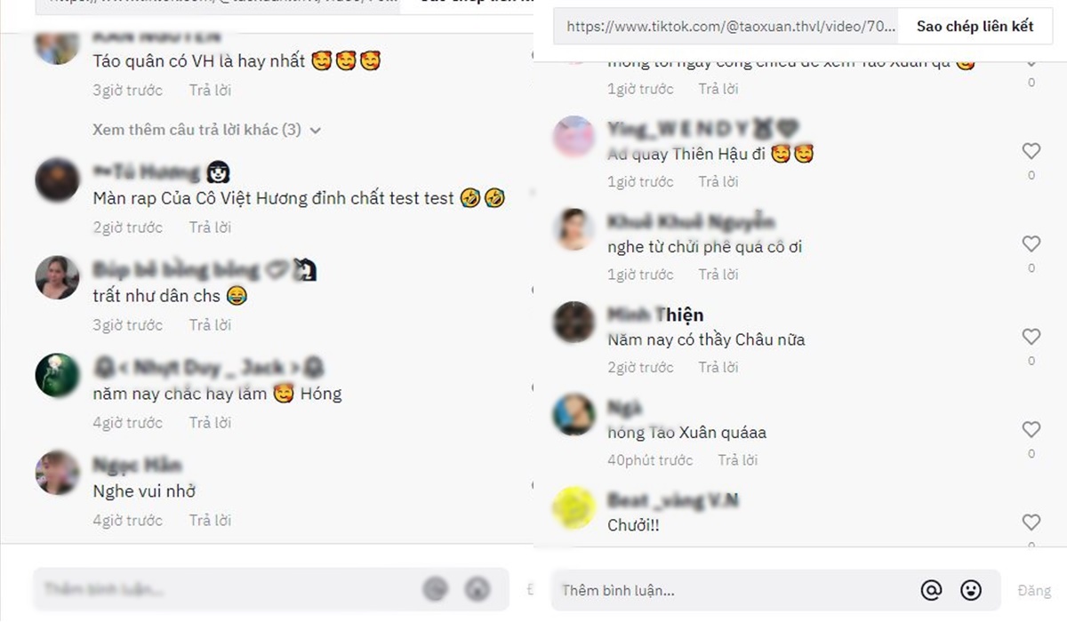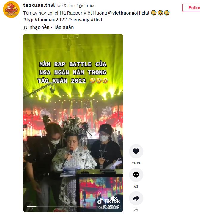Mới đây, vào ngày 8/1, kênh Tiktok của chương trình Táo Xuân - Đài truyền hình Vĩnh Long đã chia sẻ nghệ sĩ Việt Hương rap không ngừng nghỉ trong suốt 1 phút. Dựa trên trang phục mà Việt Hương đang mặc cùng hậu kỳ phía sau, có thể đoán rằng đây chính ra trích đoạn do nữ danh hài đảm nhiệm trong chương trình Táo Xuân 2022.