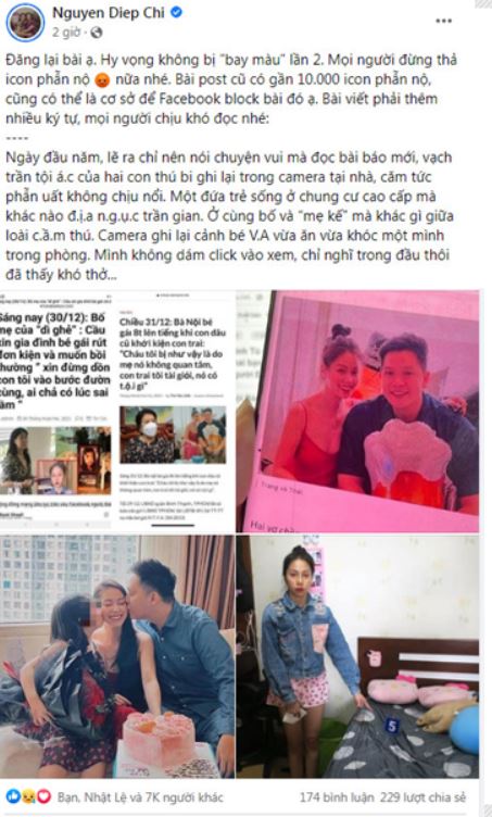 Giữ đúng lời hứa, ngay trong chiều 2/1 lúc 14h55 phút MC Diệp Chi đã đăng tải lại bài viết bị Facebook xóa cách đây không lâu với hy vọng công lý sẽ được thực thi, cái ác phải bị trừng trị. Đăng lại bài ạ. Mọi người đừng thả icon phẫn nộ nữa nhé. Bài post cũ có gần 10.000 icon phẫn nộ, cũng có thể là cơ sở để Facebook block bài đó ạ.