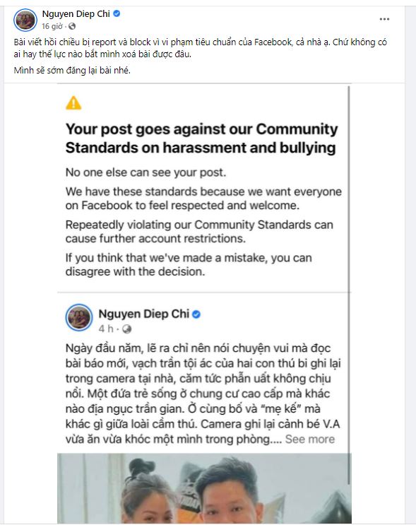 Tuy nhiên chỉ vài tiếng sau, do bài viết nhận về lượng tương tác rất lớn, cùng sự đồng tình của khán giả trong việc bày tỏ cảm xúc phẫn uất này đối với những gì xảy ra với bé V.A đã khiến Facebook hiểm nhầm sử dụng ngôn từ thù ghét. Do vậy bài viết của Diệp Chi đã bị Facebook xóa bài. Đến gần 1h sáng nay (2/1), cựu MC Đường lên đỉnh Olympia lên tiếng khẳng định: "Bài viết hồi chiều bị report và block vì vi phạm tiêu chuẩn của Facebook, cả nhà ạ. Chứ không có ai hay thế lực nào bắt mình xoá bài được đâu. Mình sẽ sớm đăng lại bài nhé".