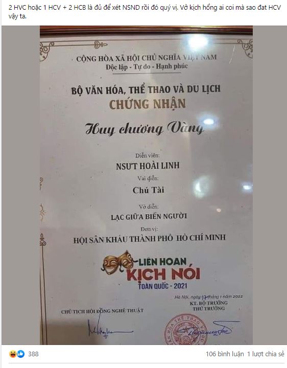 Đáng nói, khi Minh Luân đăng cận cảnh bằng khen của Hoài Linh đã nhận được sự chú của cư dân mạng. Hình ảnh bằng khen giải thưởng của Hoài Linh đã được lan truyền và bàn luận trong nhiều group kín có hàng trăm thành viên.