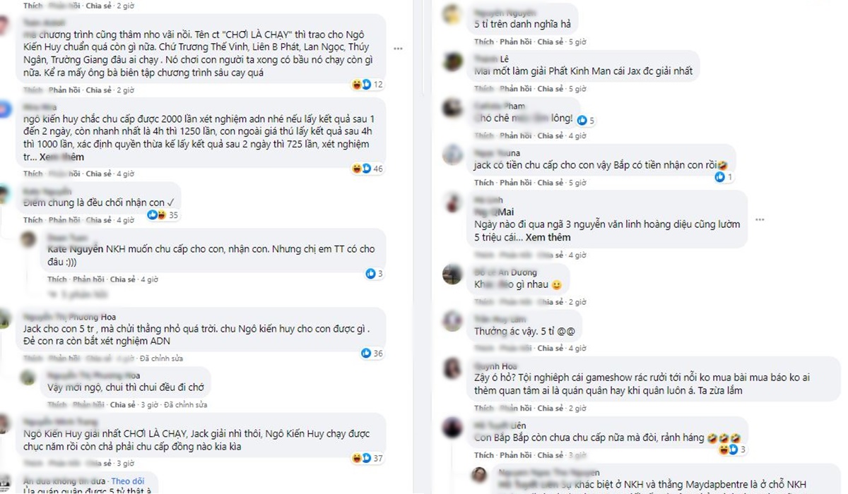 Theo đó, trước tin đồn Ngô Kiến Huy nhận được giải thưởng trị giá 5 tỷ đồng, nhiều cư dân mạng đã được dịp mỉa mai khi nhắc lại lùm xùm trợ cấp 5 triệu cho con với bạn gái cũ của Jack. Thậm chí có bình luận còn châm biếm rằng số tiền thưởng này nên tặng cho Jack để nam ca sĩ có thể chu cấp cho con nhiều hơn.