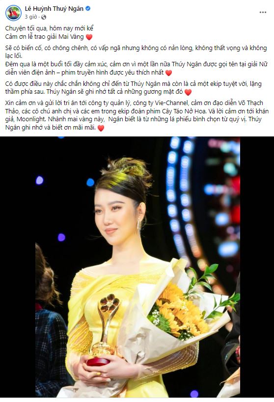 Mới đây, trên trang cá nhân, Thúy Ngân đã có bài đăng rất dài chia sẻ về cảm xúc ‘không thể kìm nén’ sau lần thứ 2 nhận tượng Mai Vàng. Cô viết: