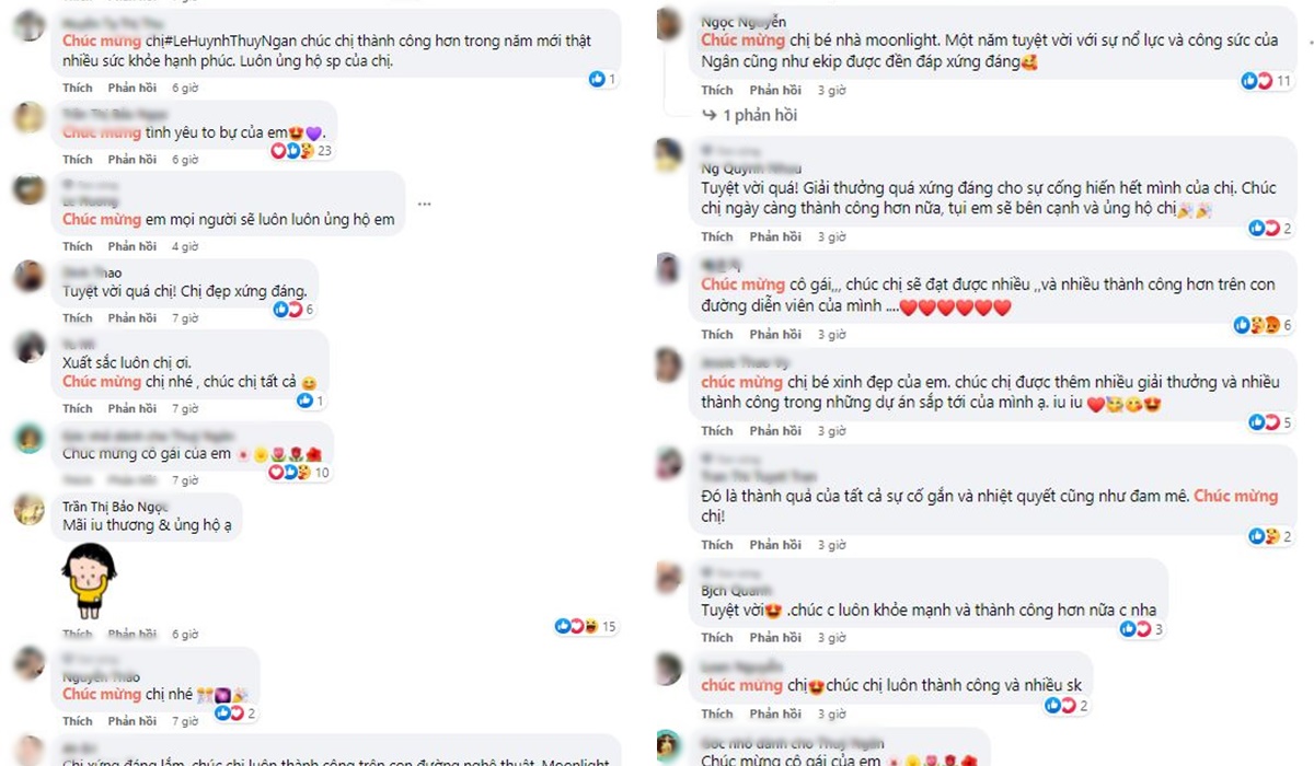 Dưới bài đăng, anh em đồng nghiệp cùng nhiều khán giả rôm rả gửi lời chúc mừng tới Thúy Ngân, khẳng định kết quả này là xứng đáng cho nhiều ngày tháng nỗ lực không ngừng nghỉ của nữ diễn viên trong thời gian qua, hy vọng trong tương lai Thúy Ngân sẽ tiếp tục gặt hái thêm càng nhiều thành công hơn nữa:
