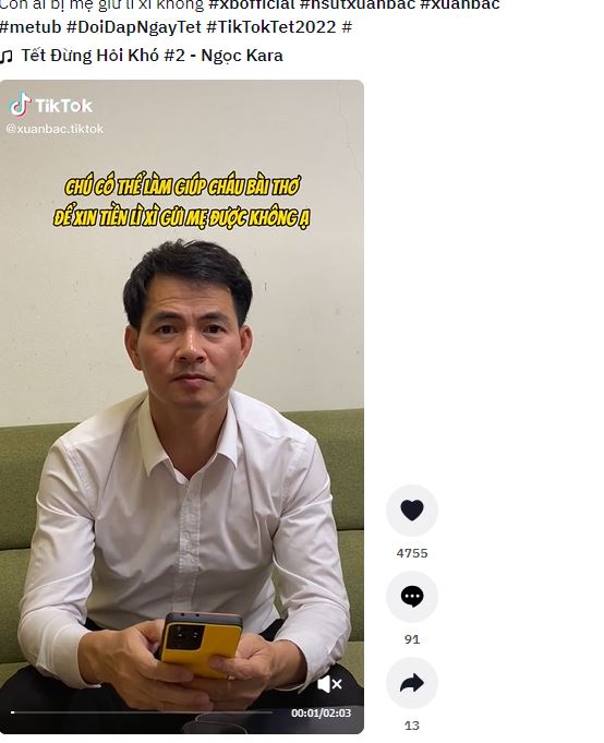 Vào ngày 25/1, Xuân Bắc đăng tải một đoạn clip “ngâm thơ” trên Tik Tok thu hút sự chú ý của cư dân mạng. Ngay sau khi đăng tải video đã thu được hàng ngàn lượt tương tác vì “đánh trúng tim đen” của người hâm mộ.