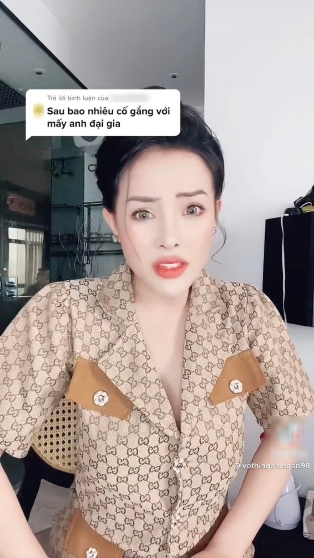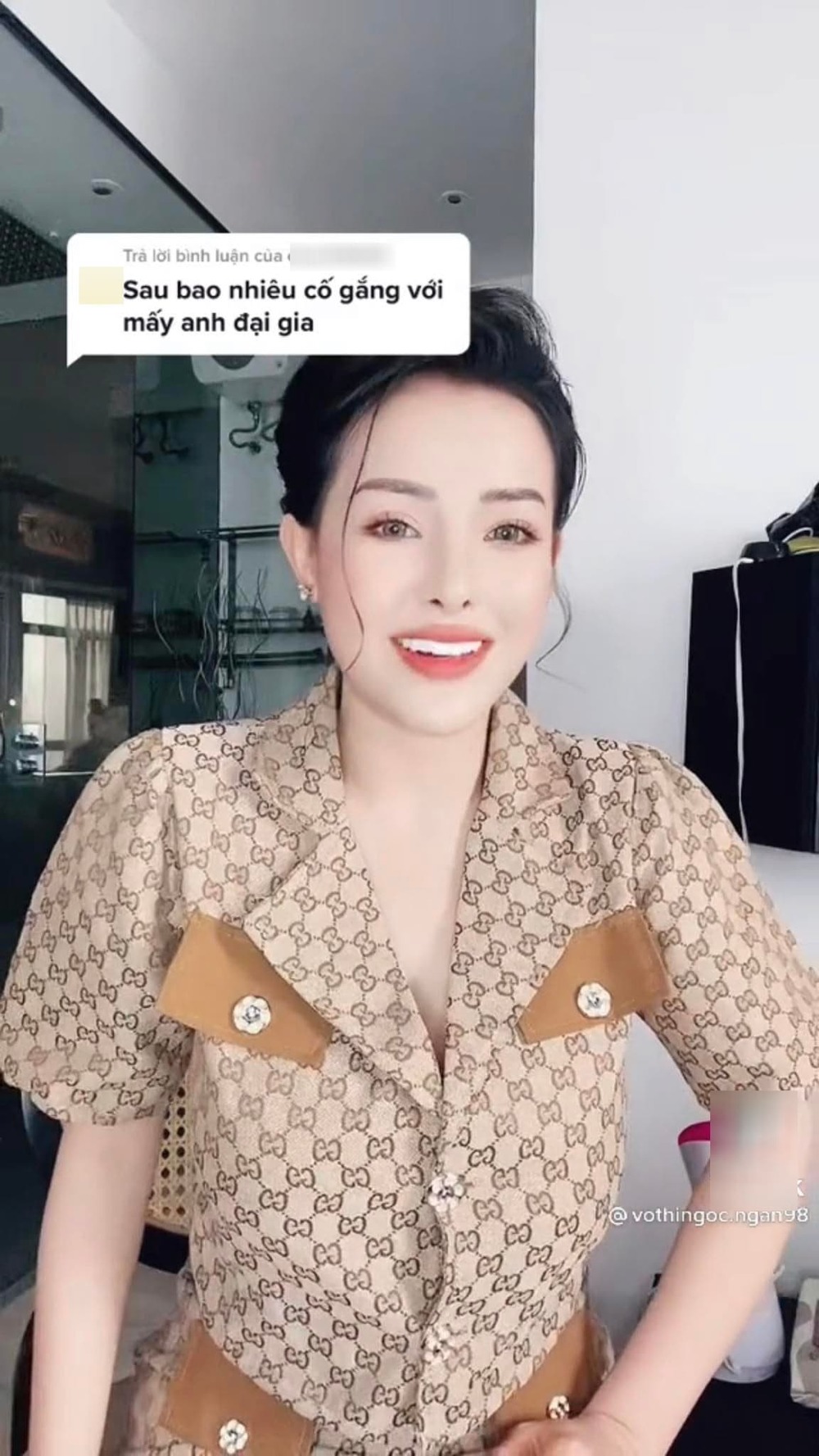 Trước những tin đồn không đúng về bản thân mình, mới đây, Ngân 98 đăng tải trên kênh TikTok cá nhân video đáp trả thẳng thắn bình luận tiêu cực của một cư dân mạng cho rằng những gì cô có được ngày hôm nay đều là "sau bao cố gắng với mấy anh đại gia".