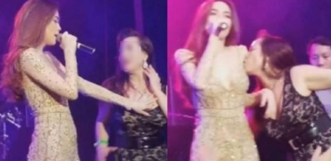 Ở một vùng trời khác bên đất Mỹ, Hồ Ngọc Hà còn gặp tình huống “dở khóc dở cười” khi bị một fan nữ quá khích hôn vào vòng 1. Ngay khi gặp sự cố, bà xã Kim Lý đã lập tức đẩy fan nữ ra và biểu diễn hết ca khúc của mình.
