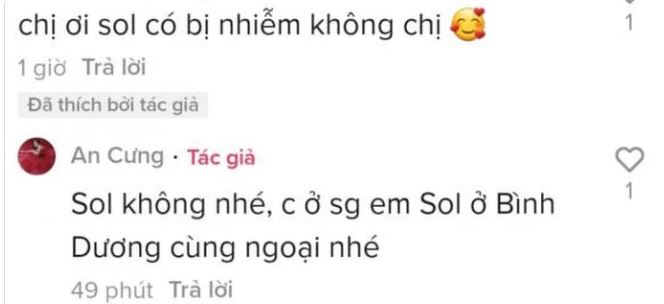 Cụ thể, khi một tài khoản đặt câu hỏi: "Bé Sol có nhiễm không chị?", Thiên An liền đáp: "Sol không nhé, chị ở Sài Gòn, em Sol ở Bình Dương cùng ngoại nhé".