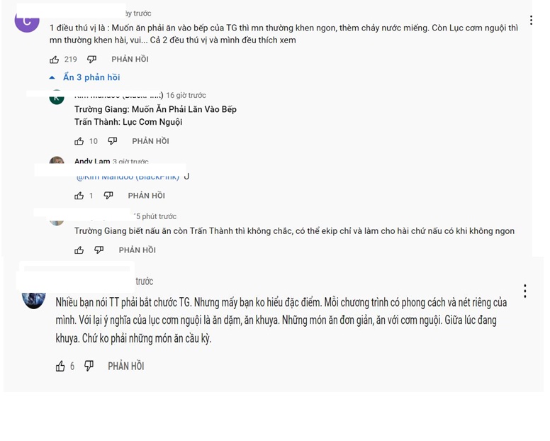Mới đây, một lần nữa, chương trình ẩm thực của cả hai cũng bị người hâm mộ đặt lên bàn cân so sánh. Đáng nói 1 số bình luận còn rằng Trấn Thành đang 'bắt chước' Trường Giang khi mở 1 show ẩm thực phát sóng trên youtube cùng chung mô típ nấu ăn và có khách mời.