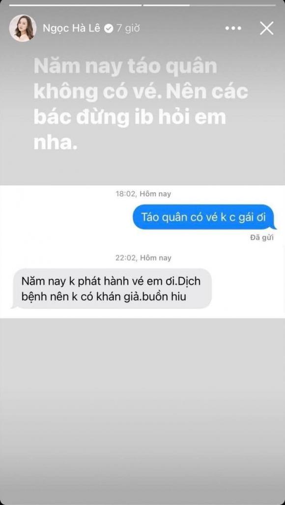 Ngay phía dưới bài đăng, Ngọc Hà cũng giải thích rằng: “Năm nay Táo Quân không có vé. nên các bác đừng inbox hỏi em nha.” Câu trả lời từ phía “người nhà” của Thiên đình tuy có chút tiếc nuối nhưng cũng nhận được nhiều sự đồng cảm của khán giả do những khó khăn của tình hình dịch bệnh năm nay.
