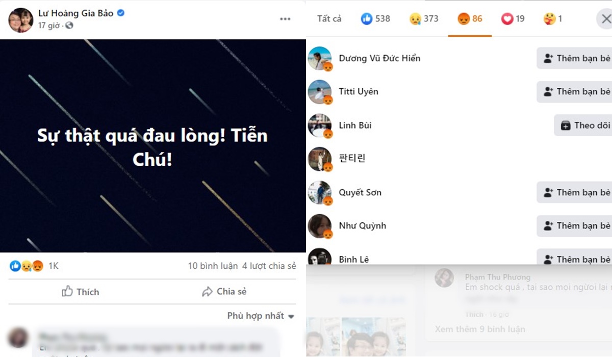 Cụ thể, Lư Hoàng Gia Bảo đã đăng tải lên trang dòng trạng thái: “Sự thật quá đau lòng! Tiễn Chú!”. Tuy nhiên có lẽ như, vụ việc hành xử thiếu tôn trọng khiến Chí Tài bỏ về giữa chừng của Gia Bảo vẫn còn khiến khán giả ác cảm. Dòng trạng thái của anh vẫn bị nhiều người thả phẫn nộ, thậm chị anh còn phải giới hạn bình luận cho bài viết này.