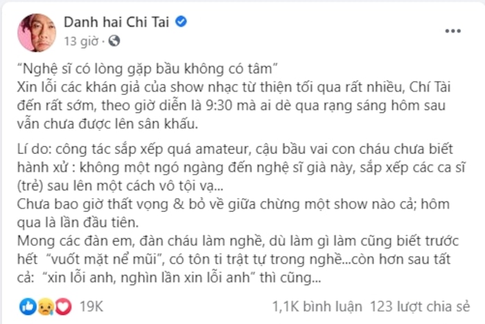 Trước đó, chỉ mới giữa tháng 11 vừa qua, cố danh hài Chí Tài đã phải bỏ về giữa một show diễn từ thiện vì thái độ của ông bầu vì dù nam danh hài đến sớm đáng lẽ phải diễn lúc 21h 20 nhưng đến tận rạng sáng hôm sau vẫn chưa được diễn. Lý do là vì bầu show không ngó ngàng đến Chí Tài và cho các ca sĩ trẻ sau lên trình diễn khác. Sau đó, bầu show này được xác nhận là Lư Hoàng Gia Bảo.