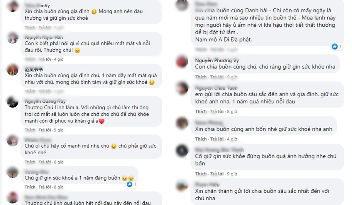 "Thành tâm chia buồn cùng chú ạ! Chú ơi giữ gìn sức khoẻ nha chú. 1 năm quá nhiều nỗi buồn, mất mát và đau thương!"