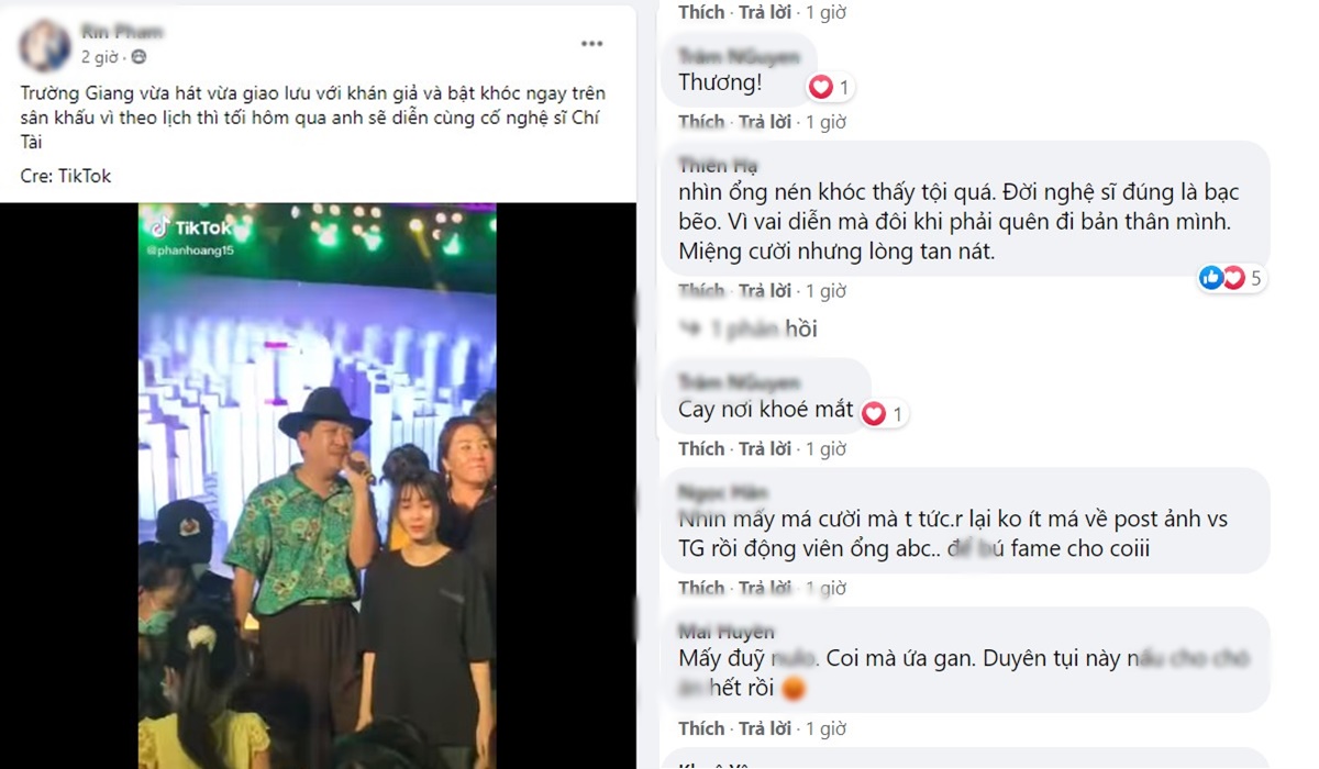 Cụ thể, một tài khoản đã đăng tải clip vào trong một nhóm kín chuyên bàn chuyện showbiz với dòng trạng thái: “Trường Giang vừa hát vừa giao lưu với khán giả và bật khóc ngay trên sân khấu vì theo lịch thì tối hôm qua anh sẽ diễn cùng cố nghệ sĩ Chí Tài!”.